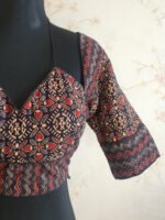 This beautifully crafted blouse features traditional Ajrakh-inspired prints in shades of indigo, red, and beige, giving it a rich ethnic appeal. Made from pure cotton, it ensures comfort, breathability, and an easy fit for long wear. The full sleeves add a graceful touch, while the adjustable back dori with matching tassels offers a custom and secure fit.