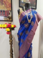 Kalyani is a stunning organza silk saree in an elegant deep blue shade, beautifully complemented by a rich golden-pink woven border that enhances its festive charm. The saree features a soft sheen and lightweight texture, making it comfortable for long wear while maintaining a luxurious appearance. With a graceful drape and subtle traditional finishing, this saree is perfect for weddings, celebrations, temple events, or evening gatherings.