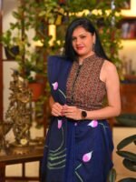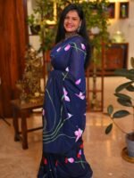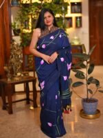 Bring artistic elegance to your wardrobe with the Neel Kamal cotton saree, a perfect blend of simplicity and handcrafted beauty. This dark blue saree features exquisite hand-painted floral designs that add a graceful charm to its minimal look. The lightweight cotton fabric ensures comfort, while the tasselled pallu enhances its traditional appeal.