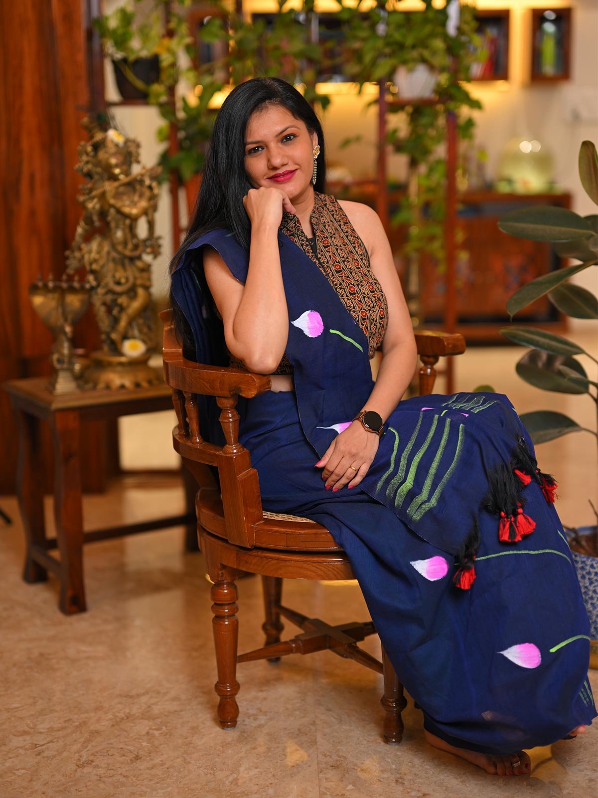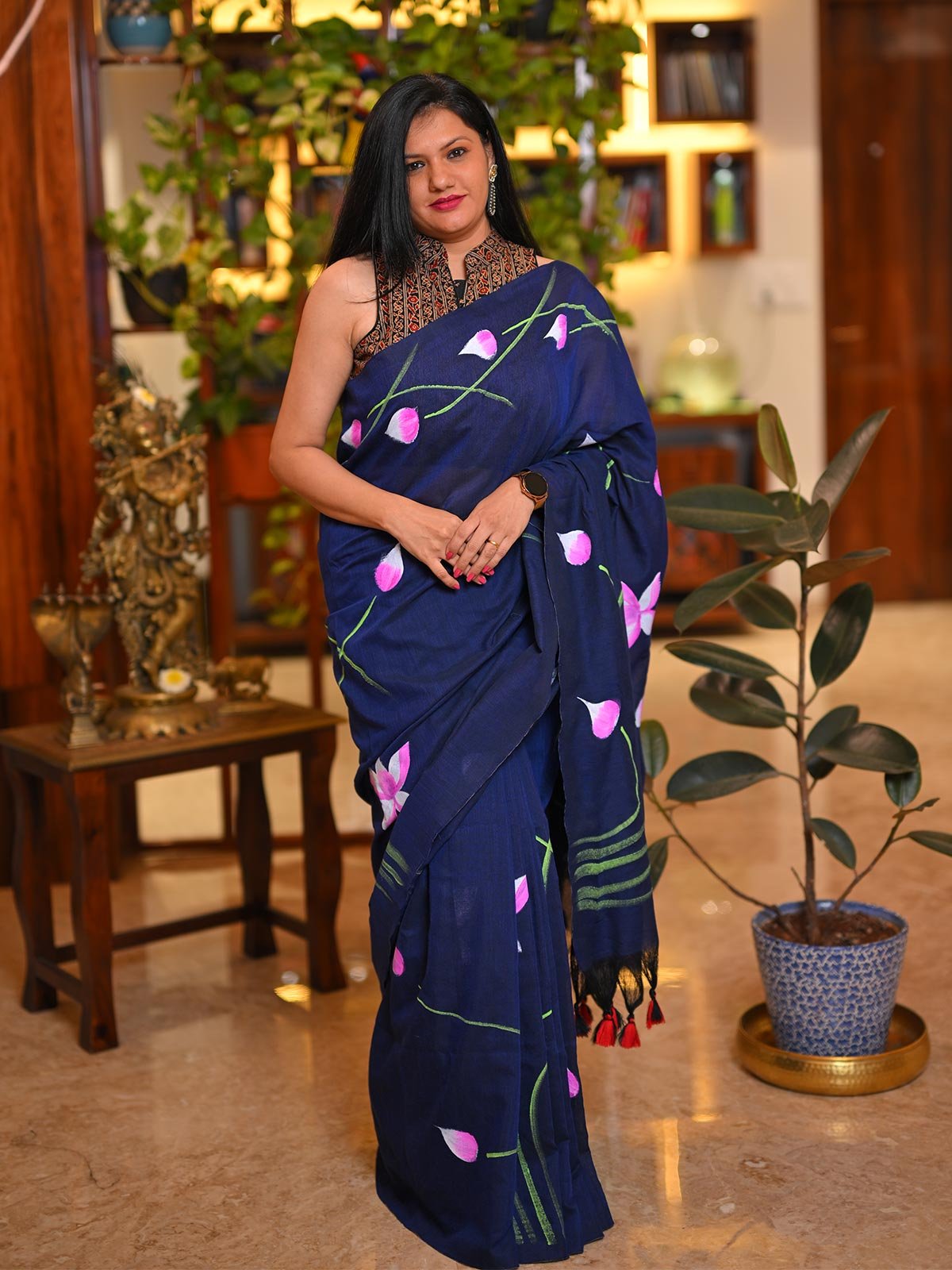 Neel Kamal Hand-Painted Dark Blue Cotton Saree with Tassels