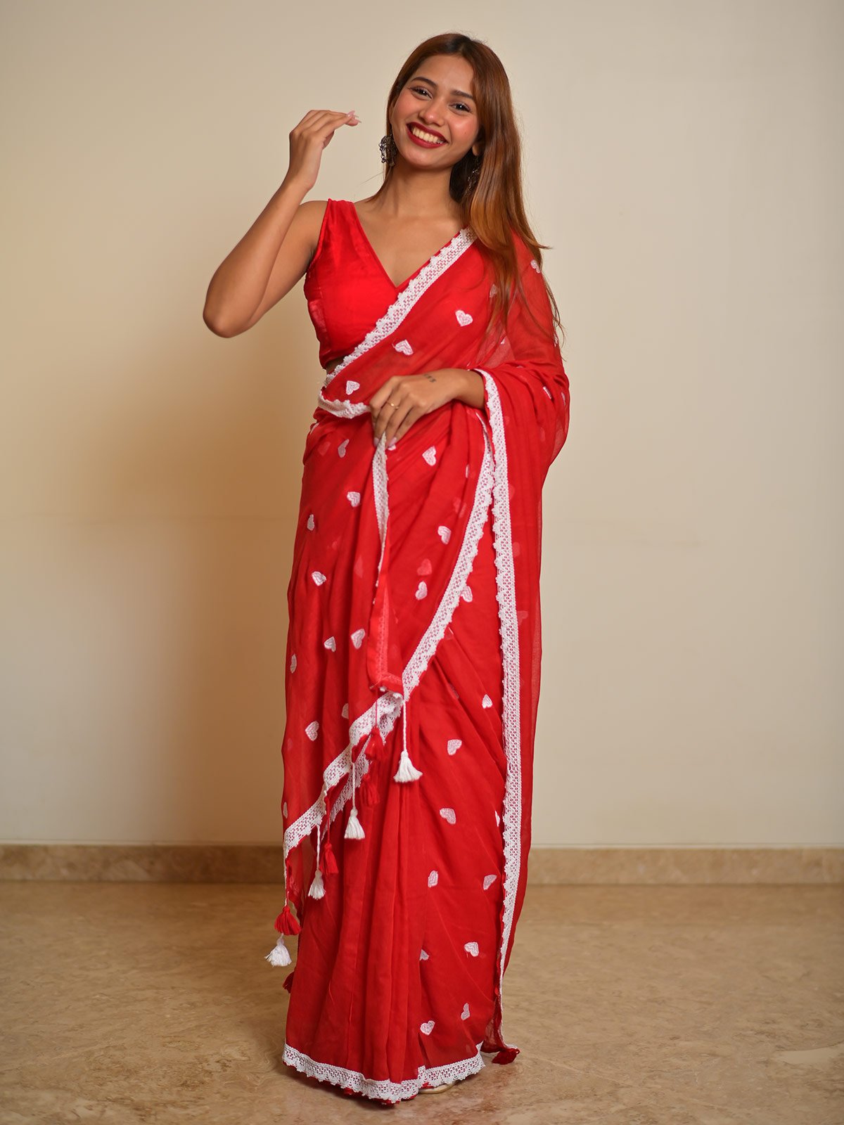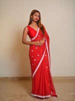 Perfect for festive moments, special gatherings, or romantic celebrations, this saree captures charm and confidence. Pair it with oxidised jewellery or a stylish blouse to elevate the look effortlessly.