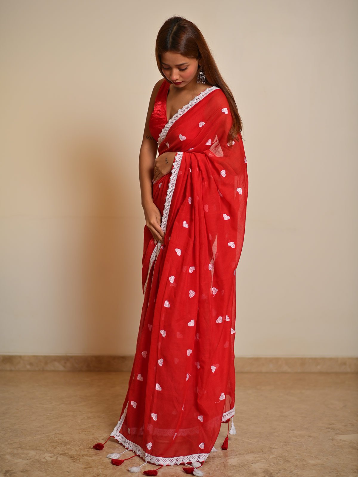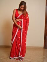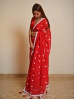 Pyar Ki Dhun is a vibrant pure mul cotton saree in a striking red shade, designed to stand out with elegance. The saree is beautifully enhanced with all-over white lace detailing, creating a delicate balance of boldness and grace. Soft, breathable, and flowy, it drapes beautifully while offering comfort for long hours.