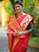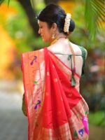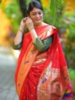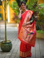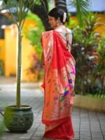 Rajashree is a regal pure soft Kanchivaram Paithani silk saree crafted in a rich red hue highlighted with luxurious gold zari work. The saree features a contrasting traditional border woven with intricate Paithani detailing, adding depth and heritage charm. Its heavy mina zari woven pallu enhances the drape with a grand festive look, making it perfect for weddings, receptions, and cultural ceremonies.