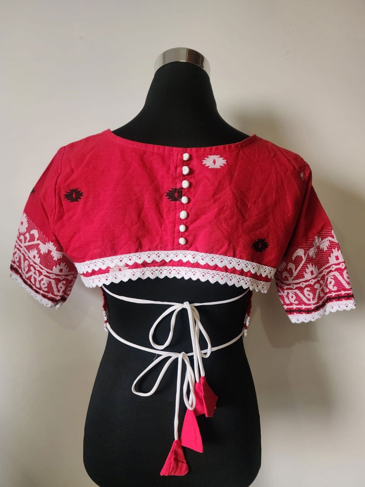 This elegant ruby red blouse is crafted from soft pure cotton and adorned with white lace detailing along the neckline, sleeves, and open back for a delicate handcrafted finish. The padded cups offer comfort and support, creating a smooth and flattering silhouette. Featuring full sleeves with traditional woven patterns and a stylish V-neck design, it blends classic charm with modern detailing.