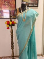 Rumi Sky Blue Mul Linen Cotton Saree with Golden Border & Tassels