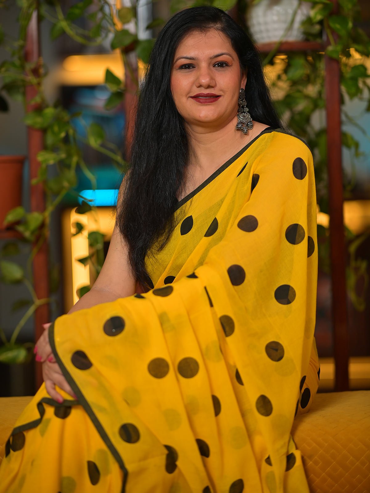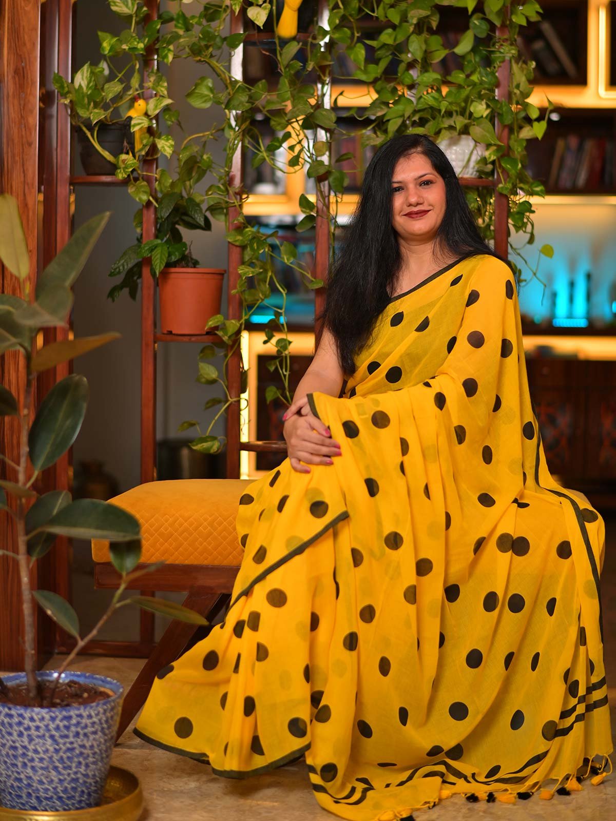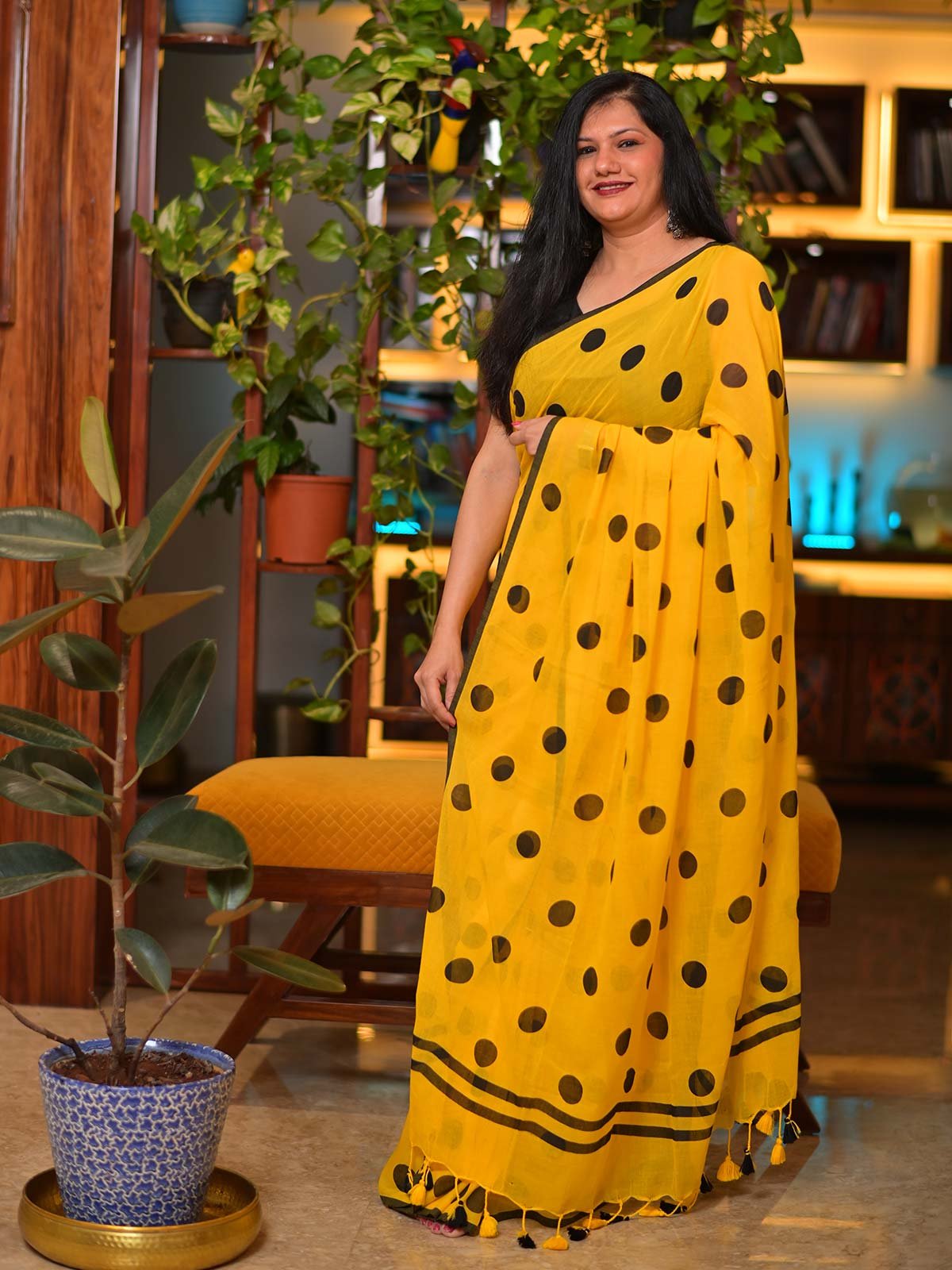 Sun Shine Yellow Mul Cotton Saree with Black Polka Dots & Tassels