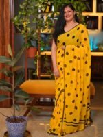 Sun Shine is a cheerful pure mul cotton saree in a bright yellow shade, crafted to bring joy and effortless elegance. The saree features bold black polka dots that add a playful twist to the classic design. Light, breathable, and easy to carry, it is perfect for sunny days, festive gatherings, or casual styling.